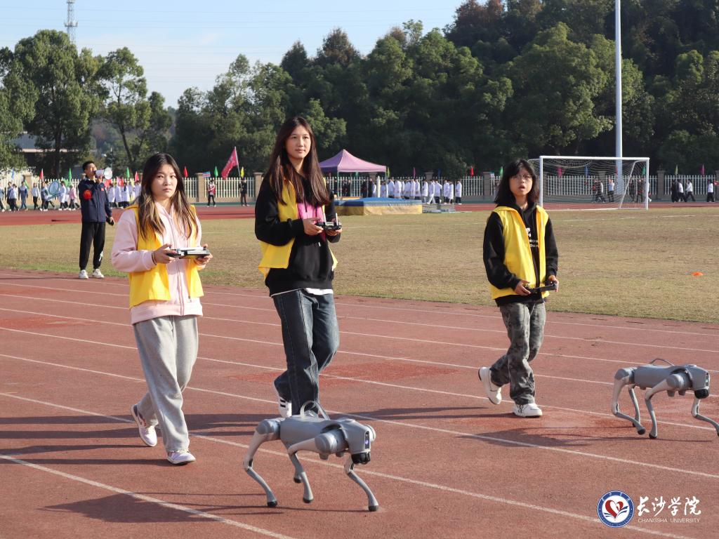 16个代表队方阵步伐豪迈、神采飞扬,依次走过主席台。与计算机科学与工程学院代表队一起亮相的两只机器狗G1吸引了全场观众的目光,它们整齐协调又憨厚可爱。机器狗基于宇数科技,由计算机学院师生以Python编程语言对其进行二次开发后,实现了编队、舞蹈和示好等动作呈现。外国语学院代表队挥动着手中的龙纹彩带,平旋平绕,螺旋缠绕,仿佛“绘制”了条条“彩龙”在运动场上飞舞。经济与管理学院代表队充分结合学院特色,手举“文化科技深度融合 青年学子创新未来”的蓝色牌匾,青春洋溢,风姿尽显。