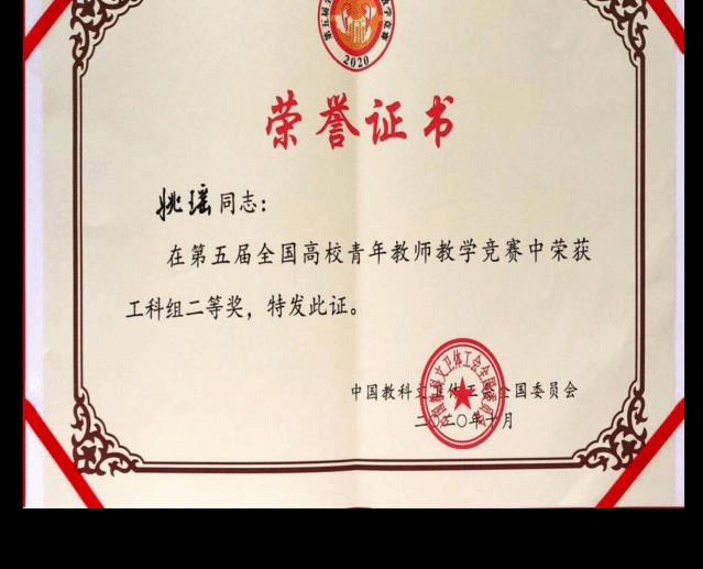 2020年1月,姚瑶老师荣获第五届全国高校青年教师教学竞赛工科组二等奖