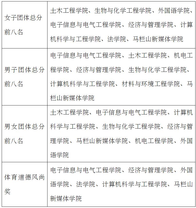 经过两天有序紧张的赛事比拼,土木工程学院获女子团体、男女团体总分第一名,电子信息与电气工程学院获男子团体总分第一名。电子信息与电气工程学院、经济与管理学院、外国语学院、法学院、计算机科学与工程学院、马栏山新媒体学院获体育道德风尚奖。