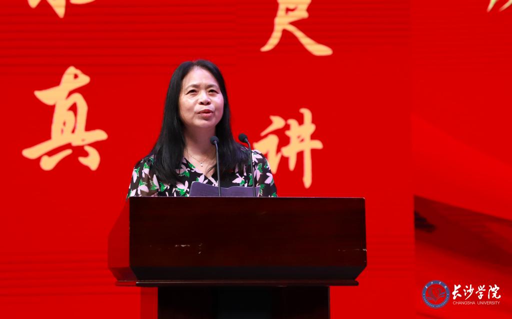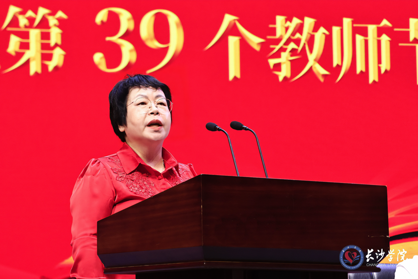 获表彰奖励教师代表、马克思主义学院谈曼延副教授用三个“专一”回顾了自己自第一个教师节起的39年从教经历:专情于一所学校、专属于一个部门、专注于一门课程。她始终坚持“四有”好老师标准,用心用情做好思政课教师的情怀打动了所有人。